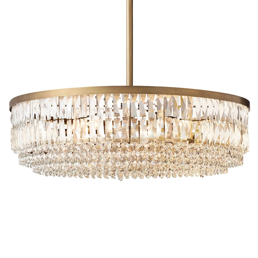 This elegant chandelier with vintage charm features a handcrafted iron frame and tiered crystals. It is perfect for dining or living interiors.
