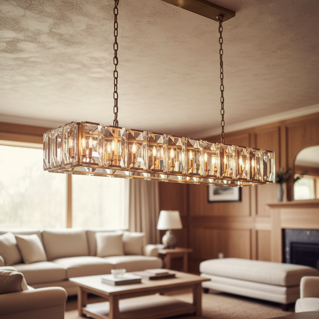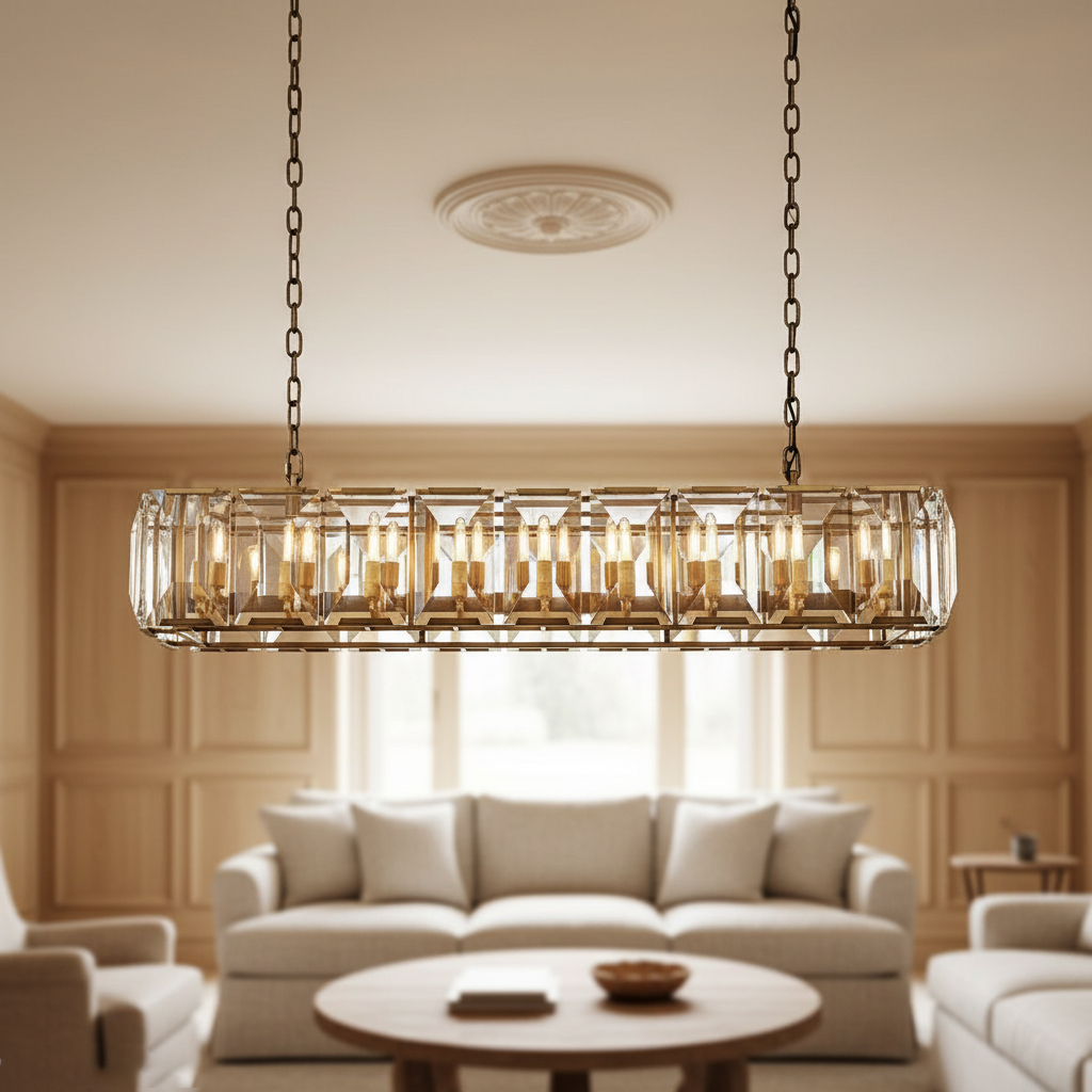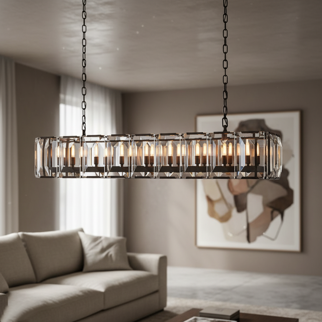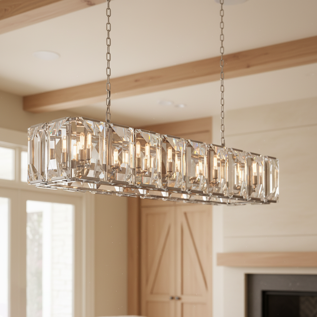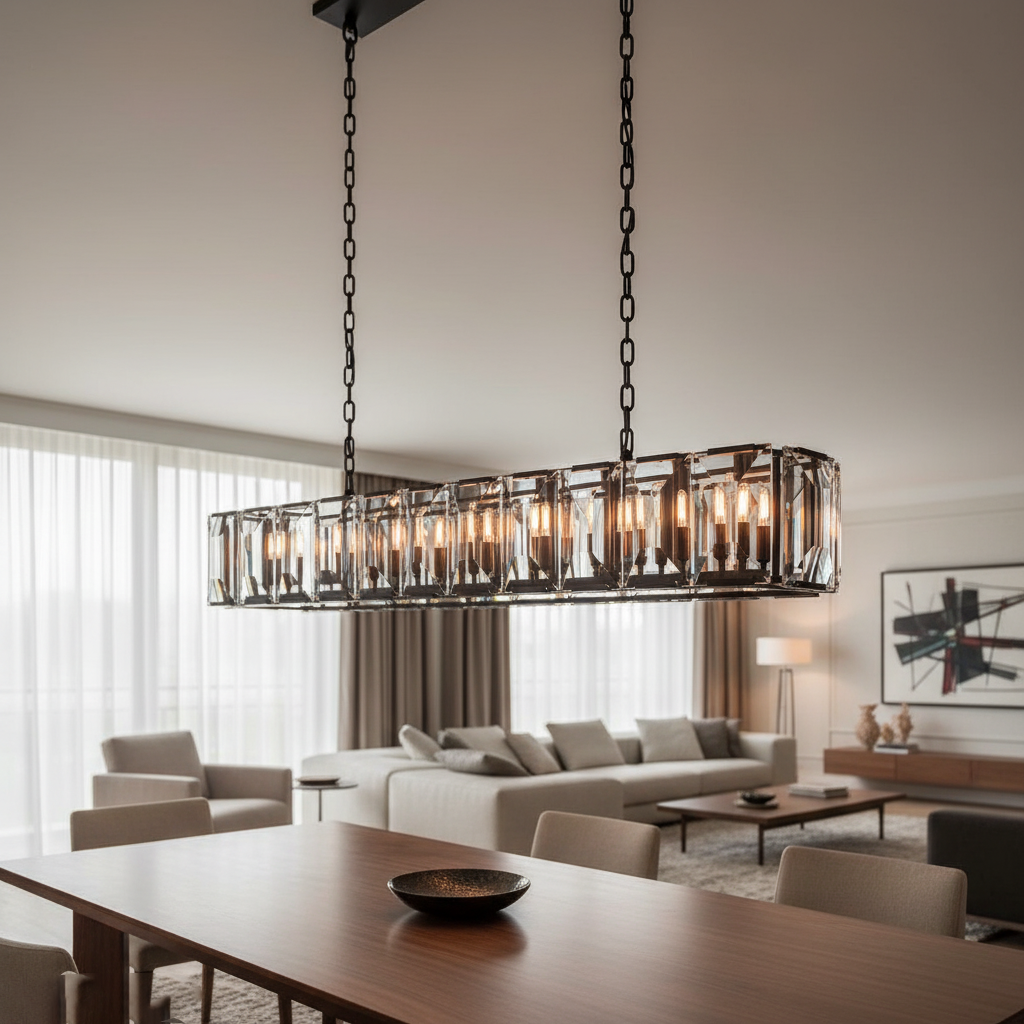 A sleek modern rectangular crystal chandelier featuring hand-cut multi-curve crystal panels for a refined, luminous centerpiece in any dining room or living space.