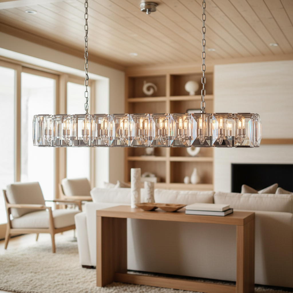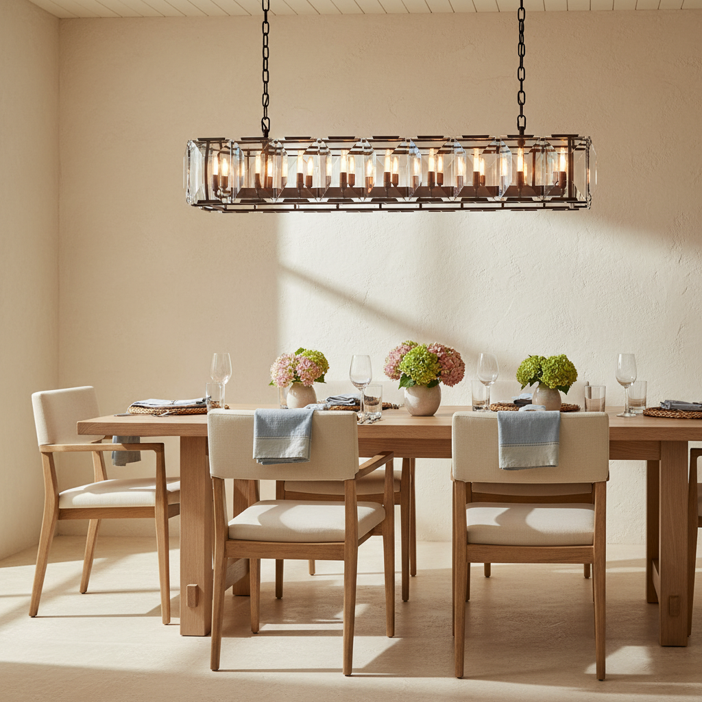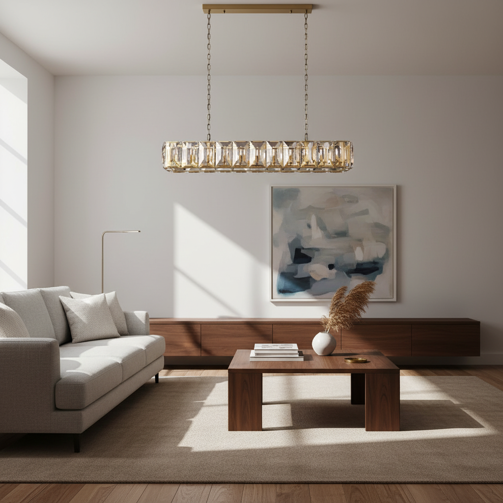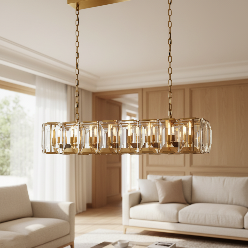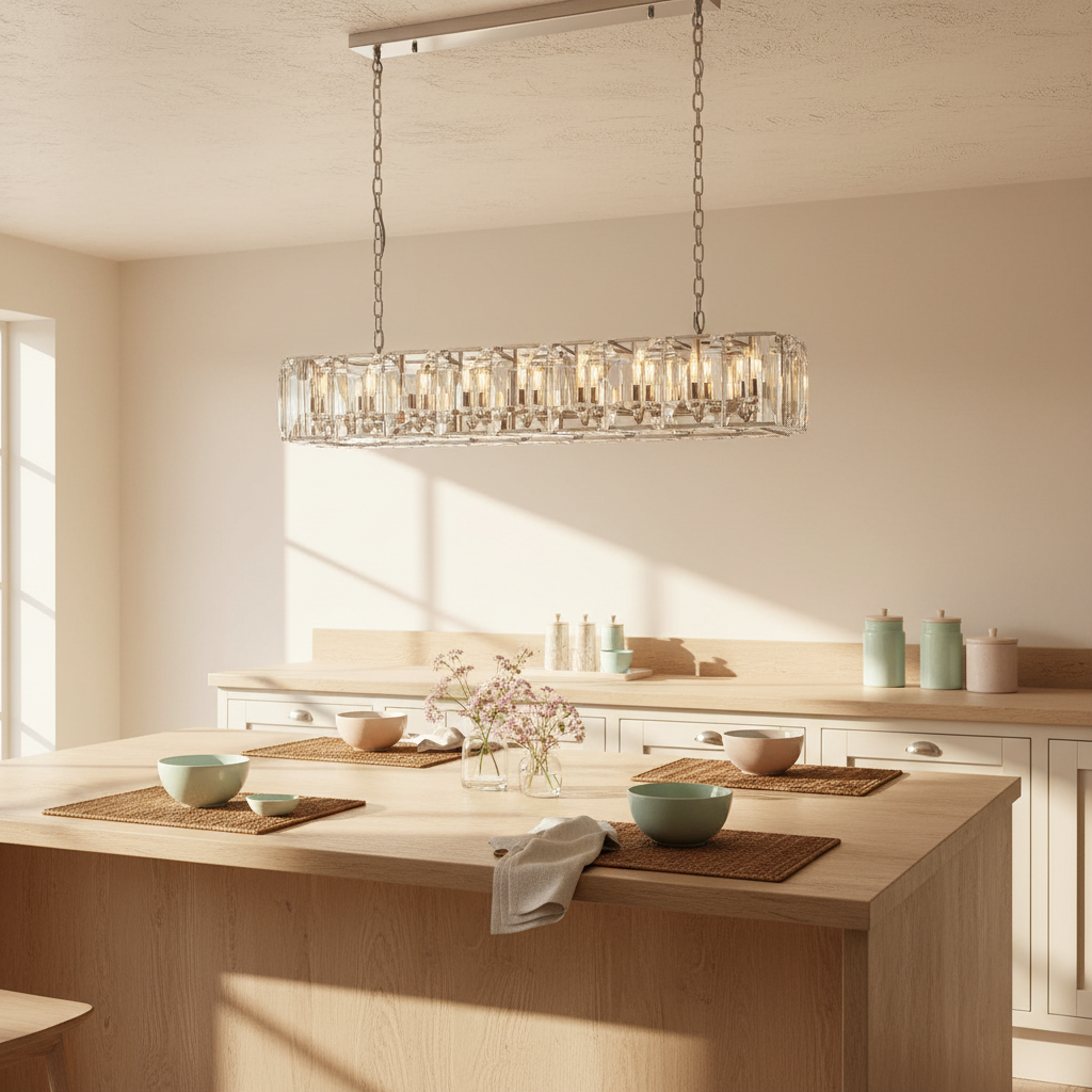 A sleek modern rectangular crystal chandelier featuring hand-cut multi-curve crystal panels for a refined, luminous centerpiece in any dining room or living space.