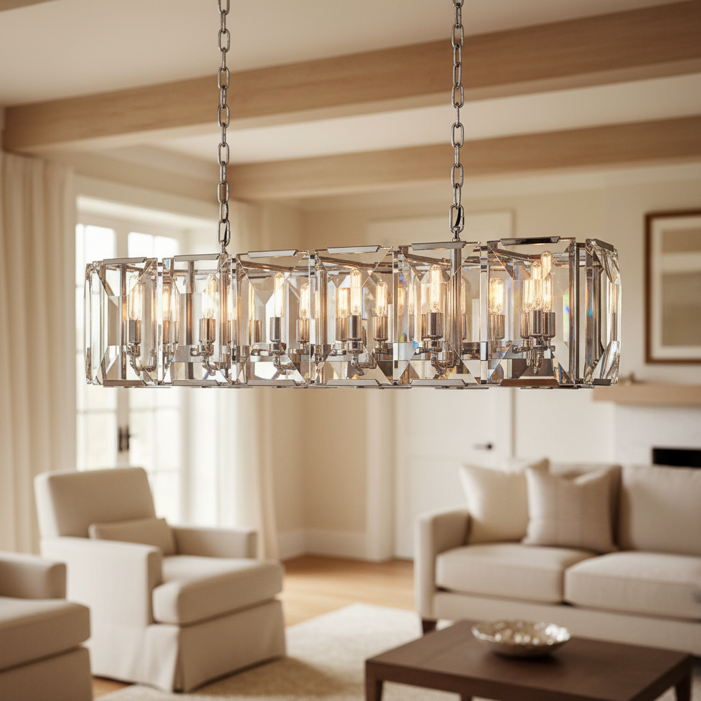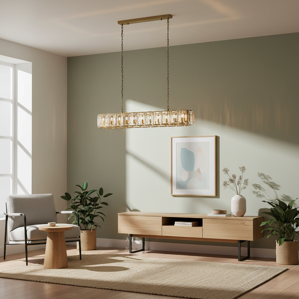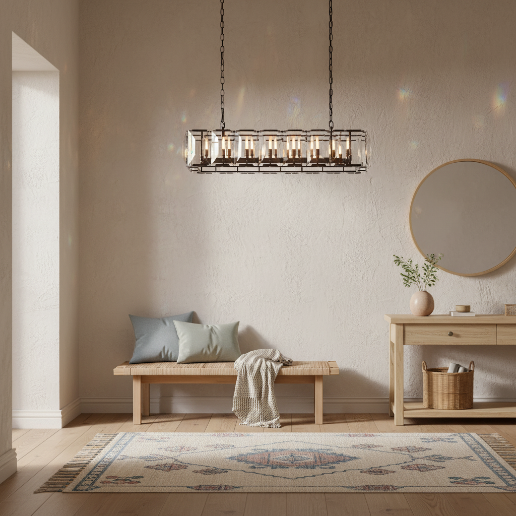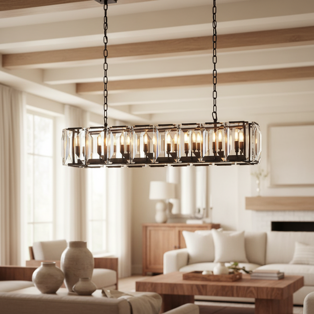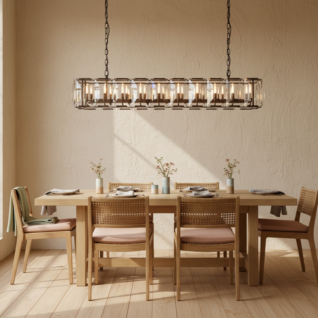 A sleek modern rectangular crystal chandelier featuring hand-cut multi-curve crystal panels for a refined, luminous centerpiece in any dining room or living space.