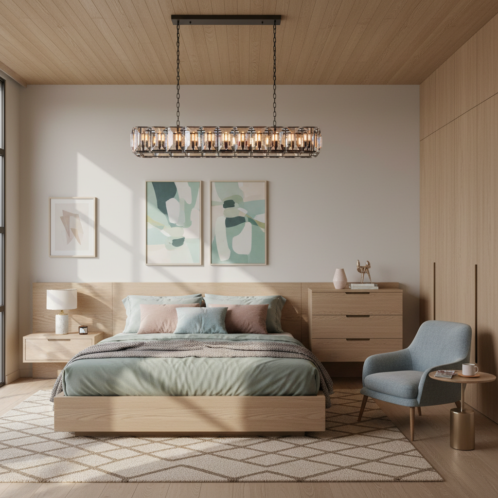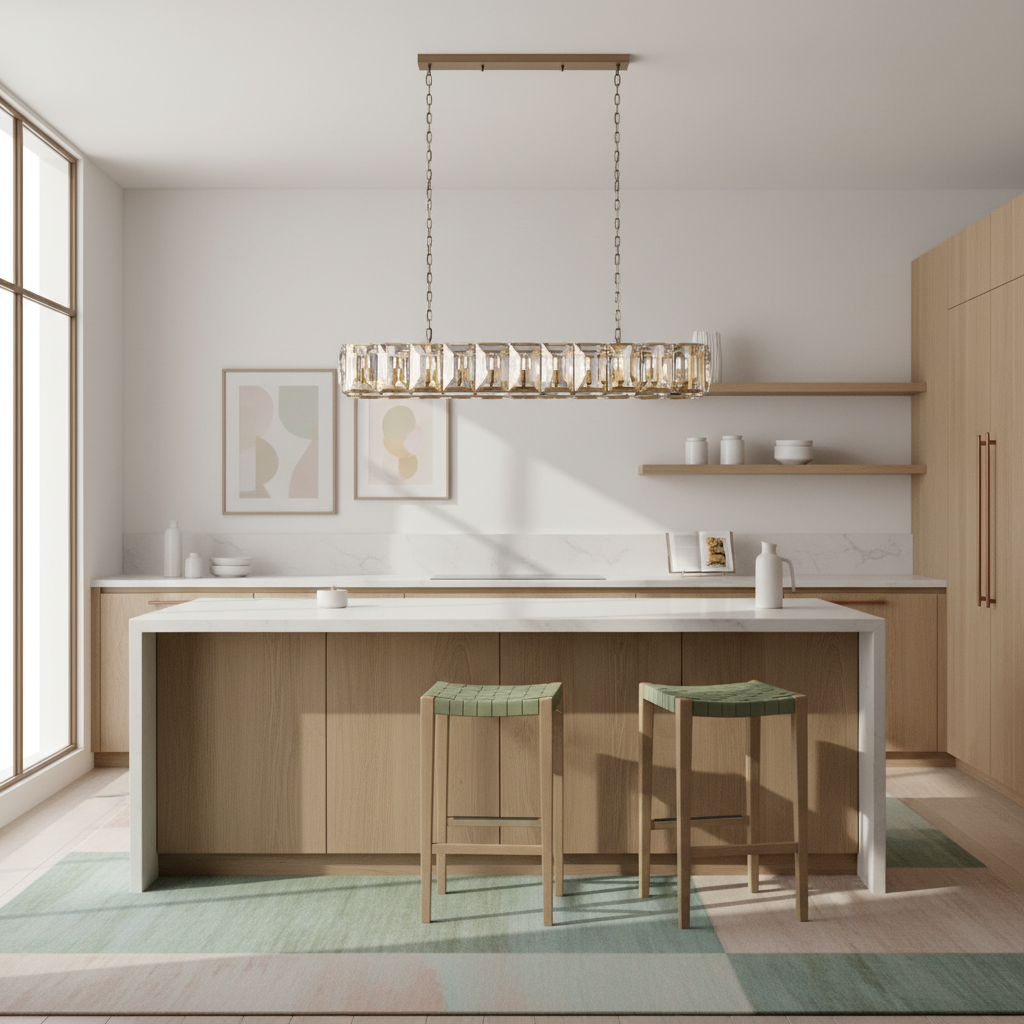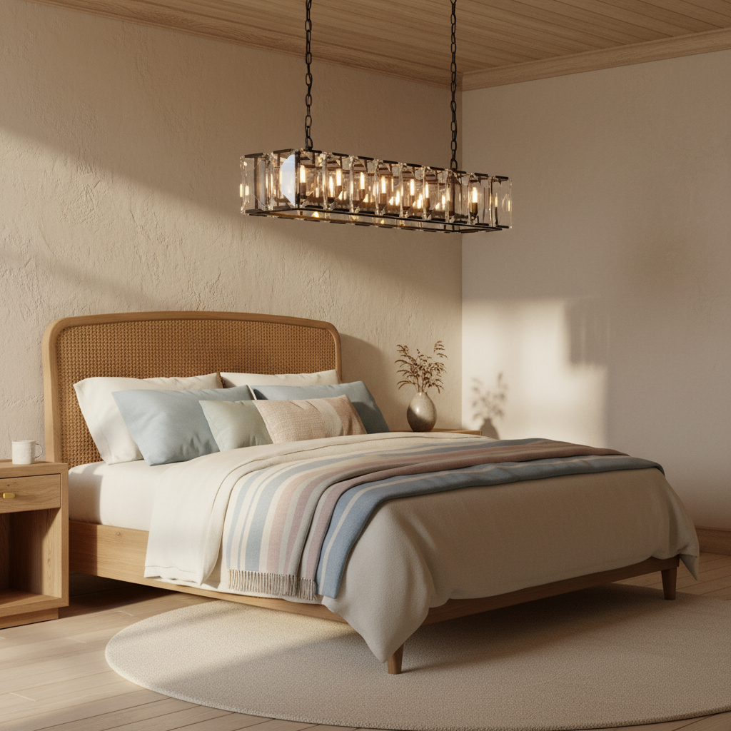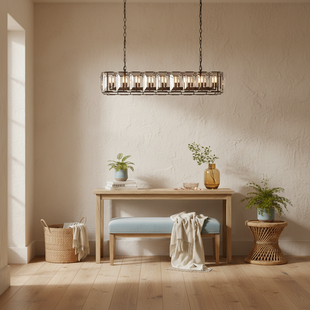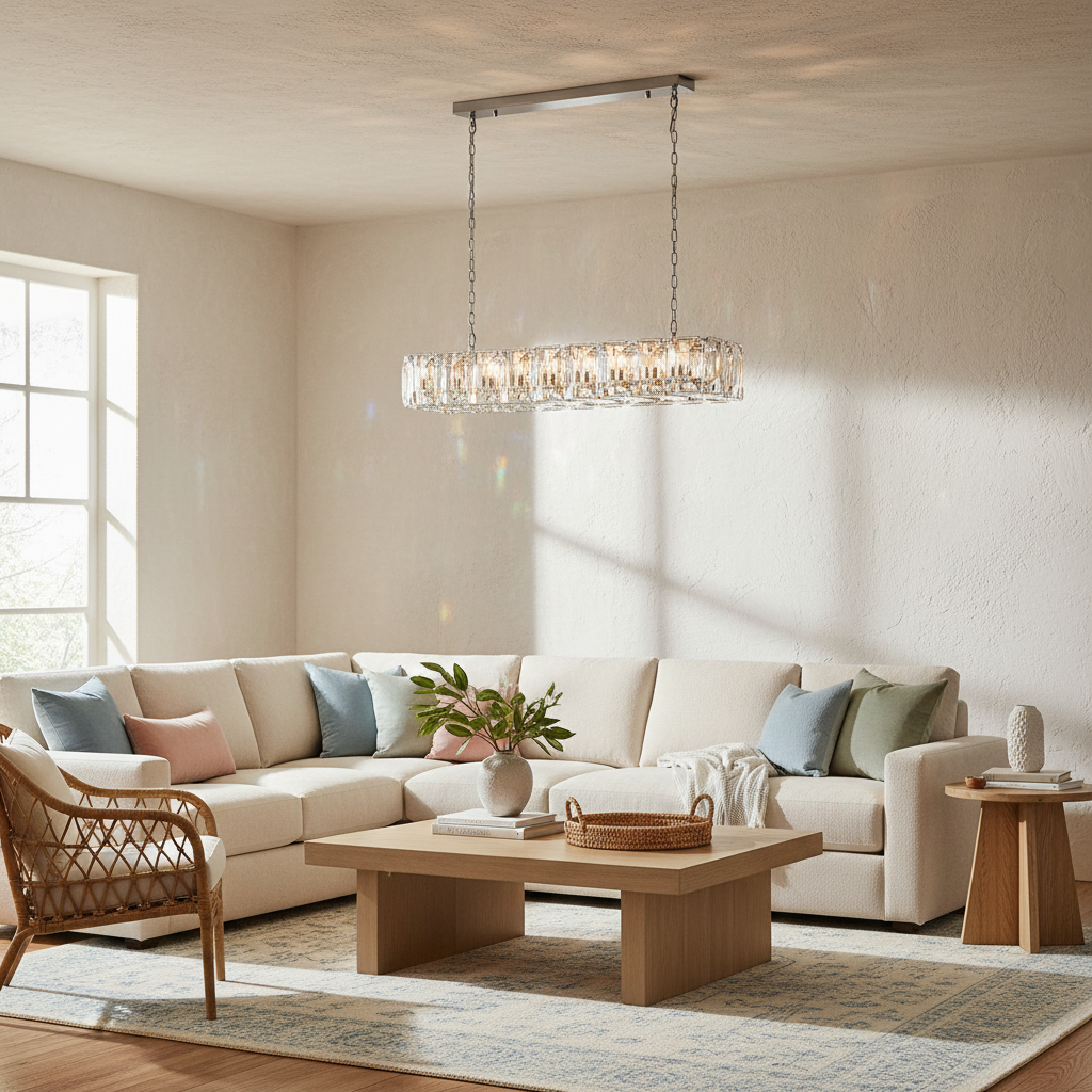 A sleek modern rectangular crystal chandelier featuring hand-cut multi-curve crystal panels for a refined, luminous centerpiece in any dining room or living space.