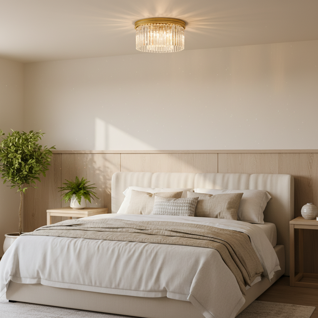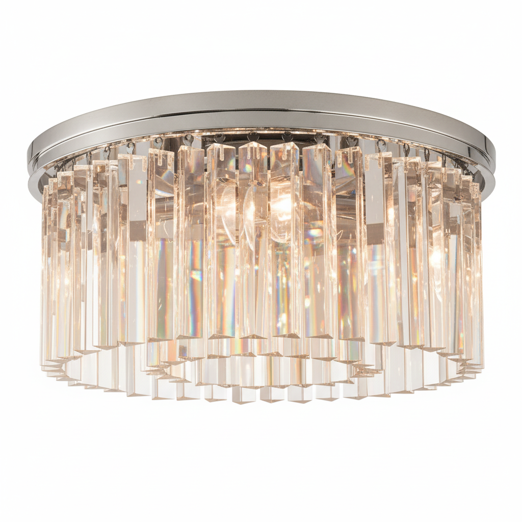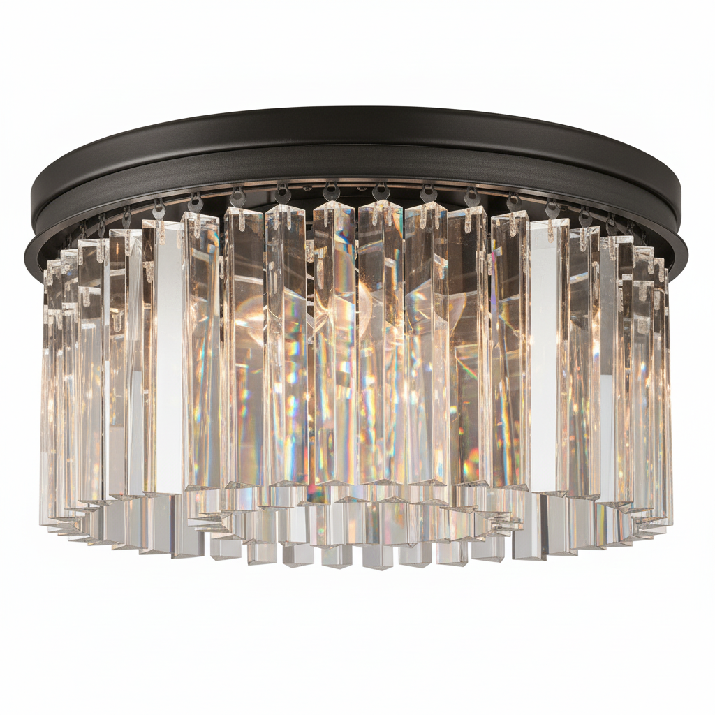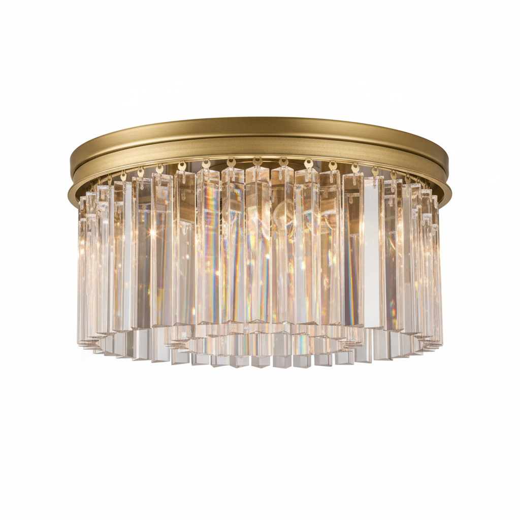 A luxury round flush-mount ceiling light with hand-arranged optical-quality crystal prisms suspended from a metal frame, creating a radiant Art Deco-inspired glow.