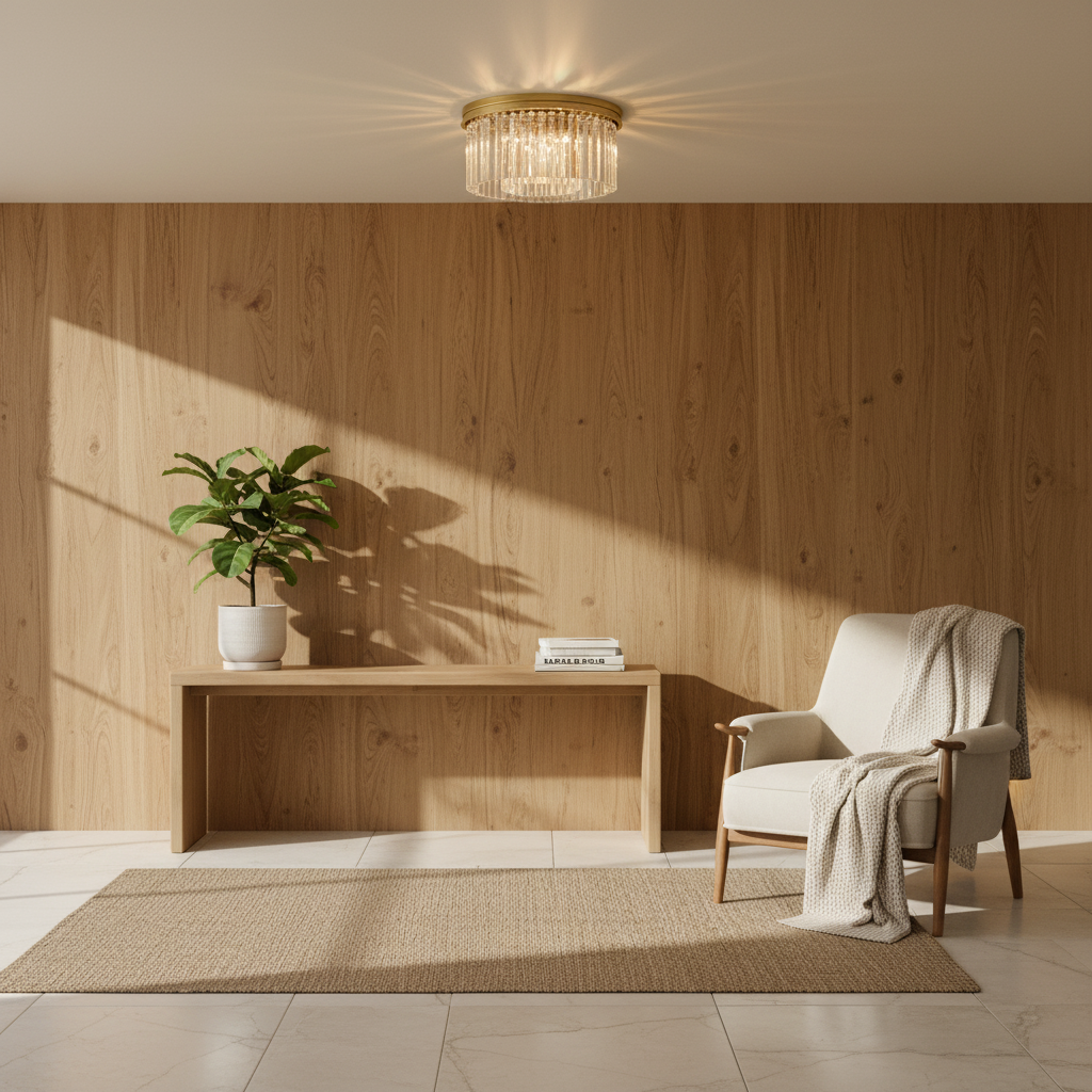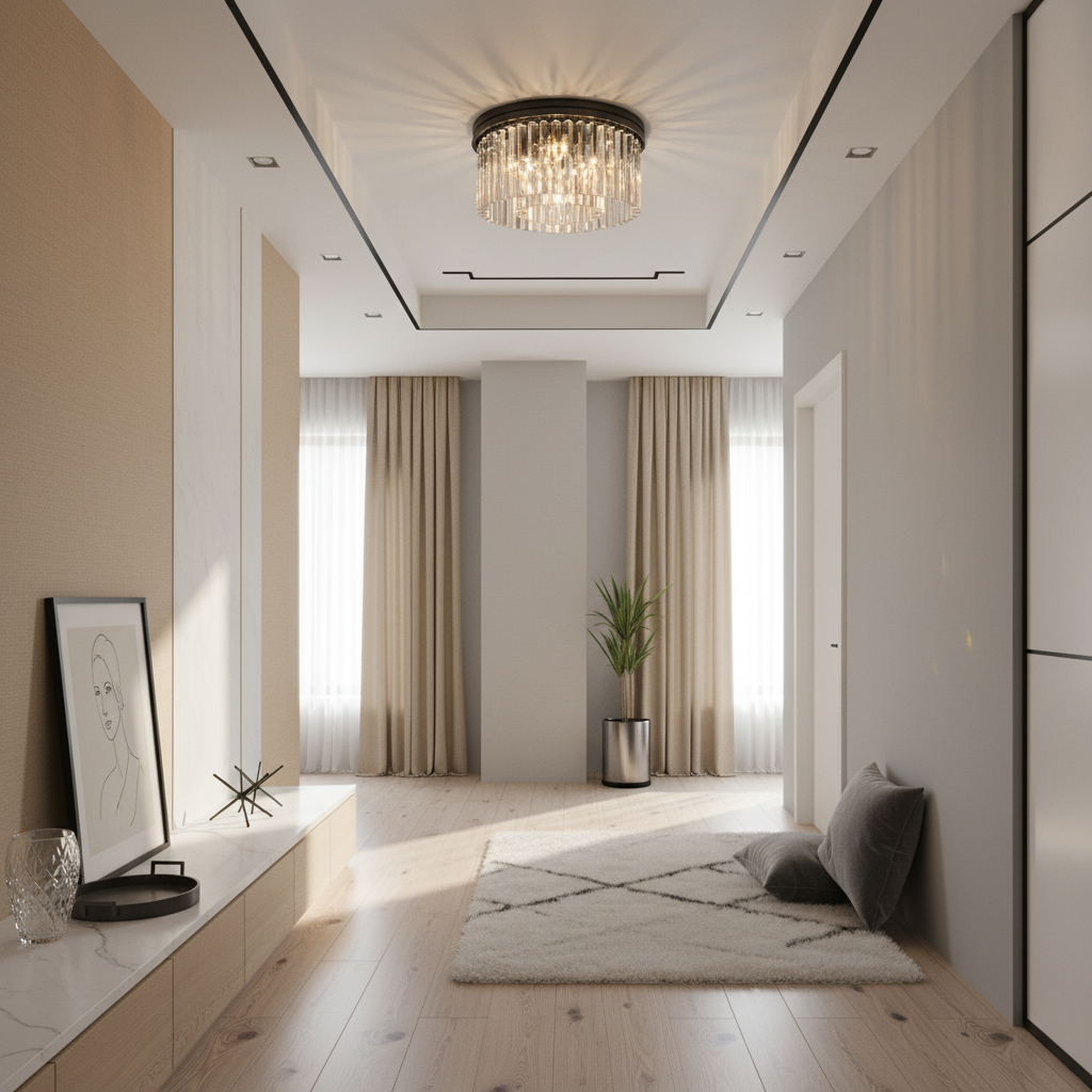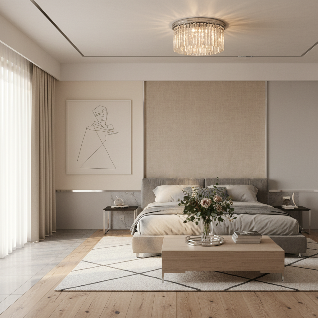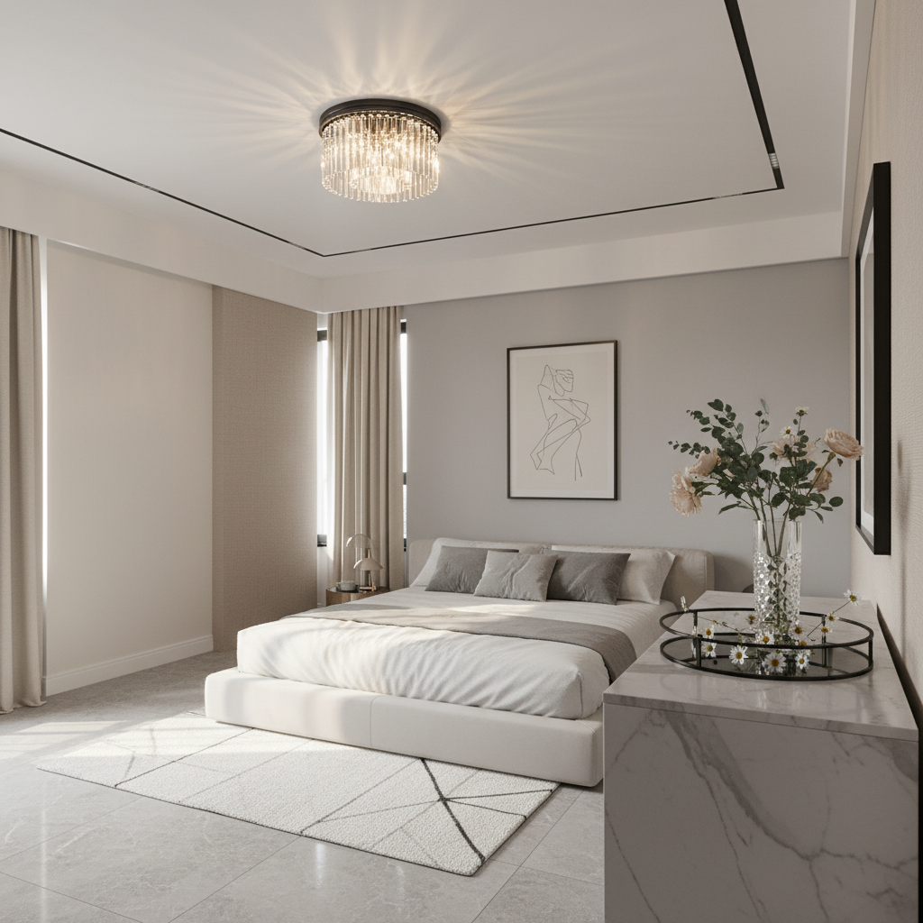 A luxury round flush-mount ceiling light with hand-arranged optical-quality crystal prisms suspended from a metal frame, creating a radiant Art Deco-inspired glow.