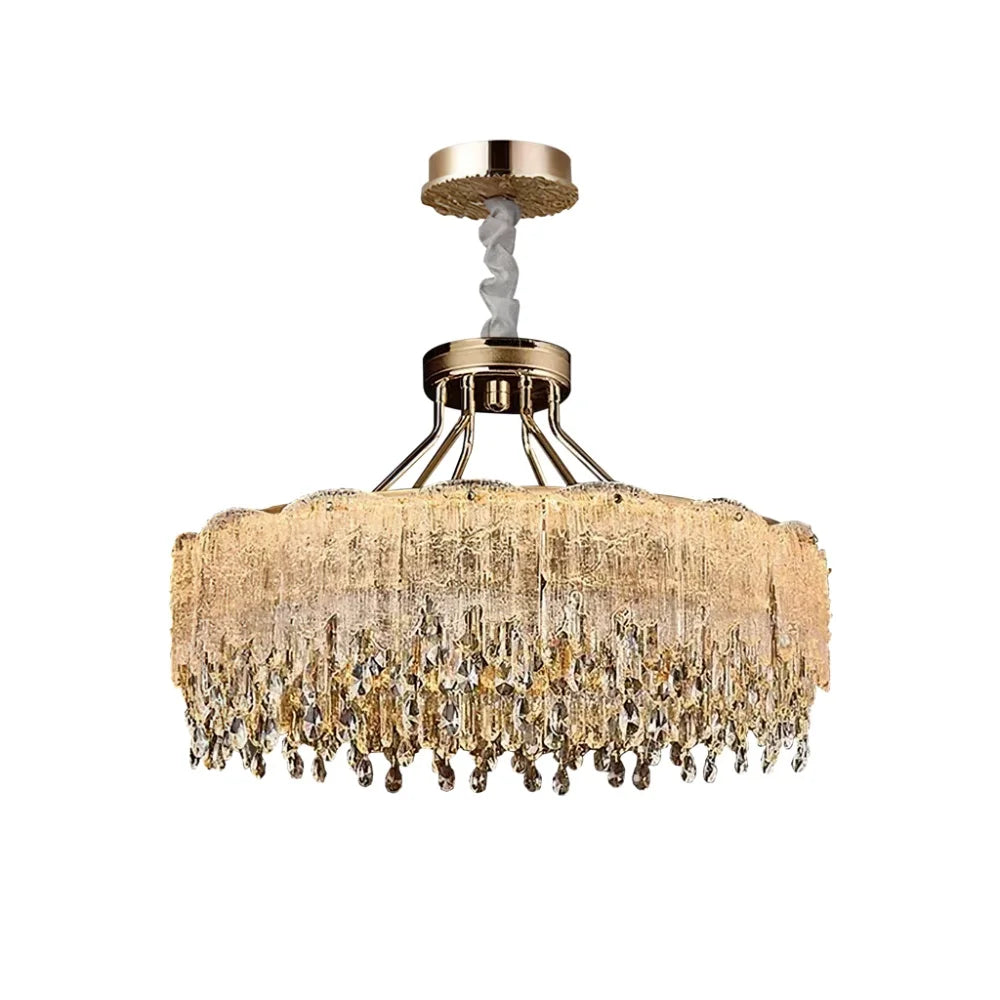 This chandelier, with a gold frame and multi-layered crystal pendants, is luxurious, suitable for various spaces, and elevates home style, ideal for refined taste.